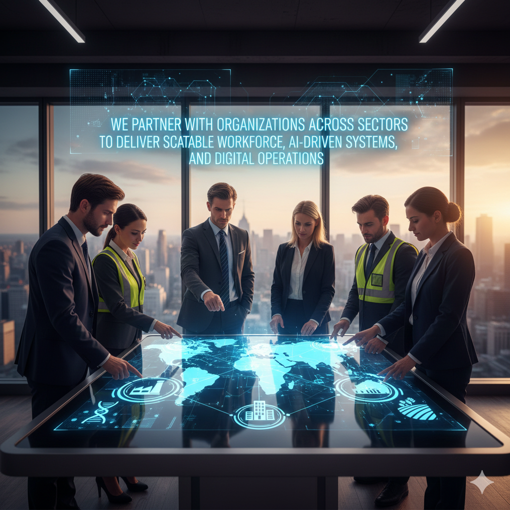 We partner with organizations across sectors to deliver scalable workforce, AI-driven systems, and digital operations.